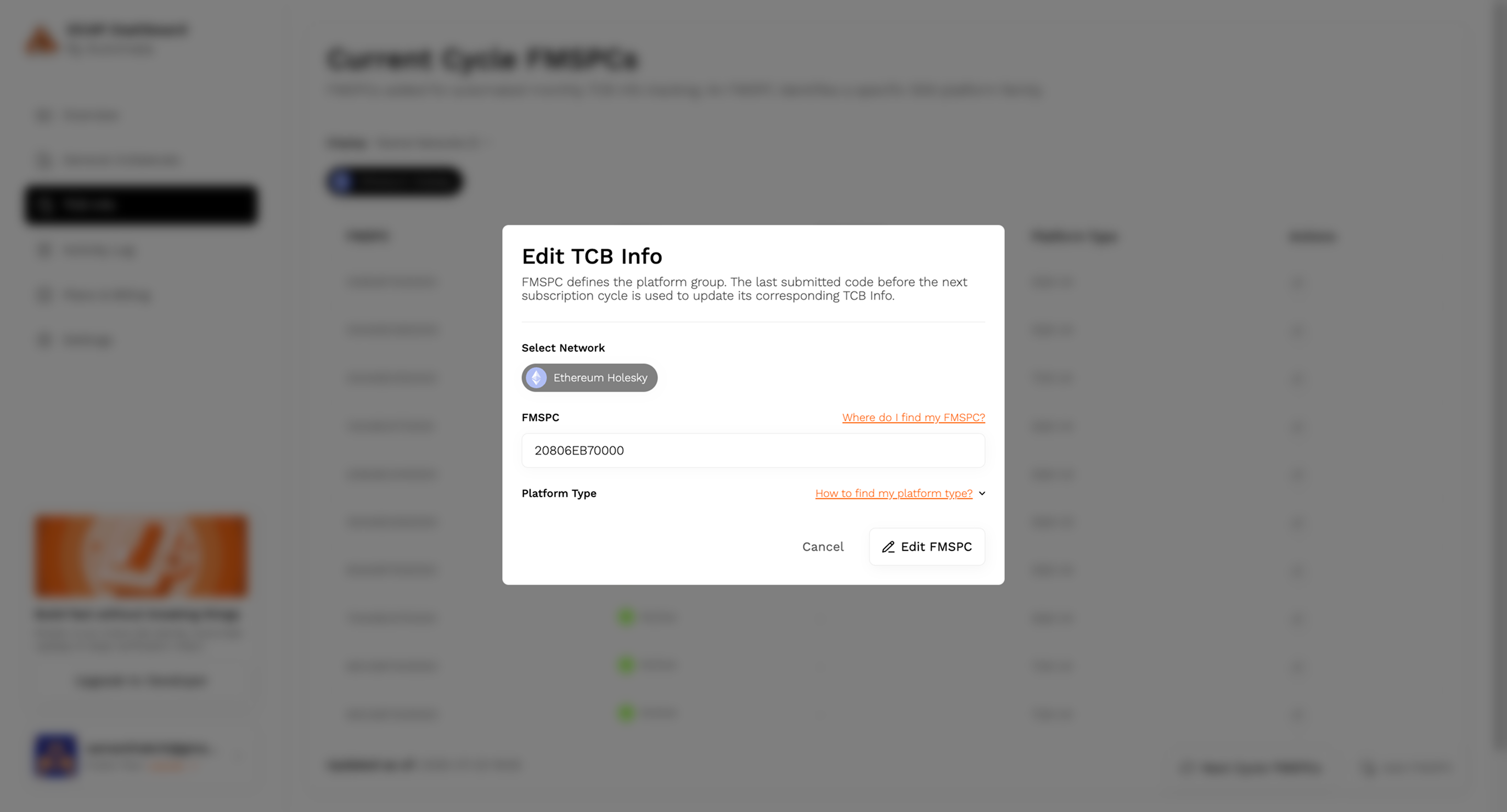 The Edit TCB Info modal allows you to modify the FMSPC and associated platform type for an existing entry. These changes will take effect in the next subscription cycle.